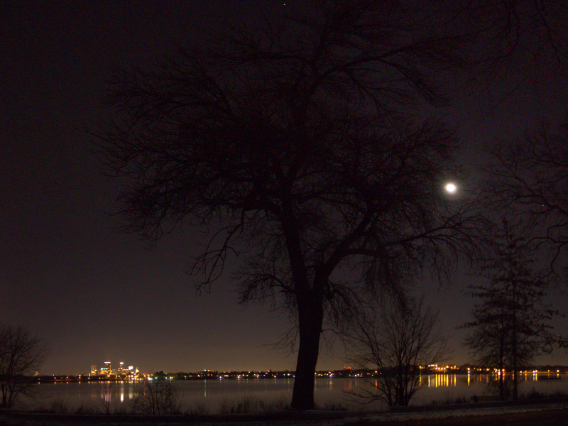 | Downtown Minneapolis and the Moon over Lake Calhoun | This is actually a panorama of several images to get the whole scene in. The star at top center is Capella; the one at right center, to the right of the Moon, is Betelgeuse. |