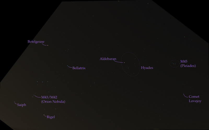 | Orion, the Pleiades and Comet Lovejoy, annotated | The same image as the above, with all the major objects labeled. |