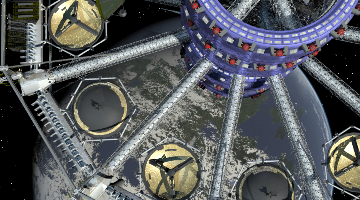 Aberdeen Station, with Petit-Terre in the background. Several cargo modules are attached to the outer ring at the upper left. A cargo pod can also be seen transferring a module between the communications dish at upper left and the main hab rings. The station's escape pods, in red, are also clearly visible.