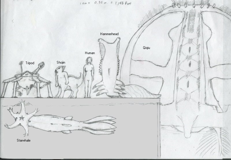 A composite shot of the sapient species of Known Space. This is of course purely imaginative; no one has ever gotten a Tripod, for example, to stand in the same space as a human. A human would probably not be allowed to show their presence to a Shojin, either. A Qiqiu, for that matter, couldn't; the atmosphere would kill either the human or the Qiqiu for them both to be in the same environment. The picture nonetheless gives a good general idea of the different species' relative sizes.