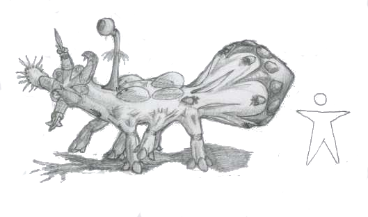 This is a Starwhale in its mobile environment suit. The entire suit, it should be noted, is bioengineered; it is all organic, and all living. The main body of the suit, for example, is distantly related to giant sea-worms which crawl the seas of the Starwhales' home planet. The Starwhale is in essence sitting in the suit's digestive tract; the suit's digestive juices have been modified to keep the Starwhale's skin clean, while providing the suit with nourishment. The template creature, though, had no legs.